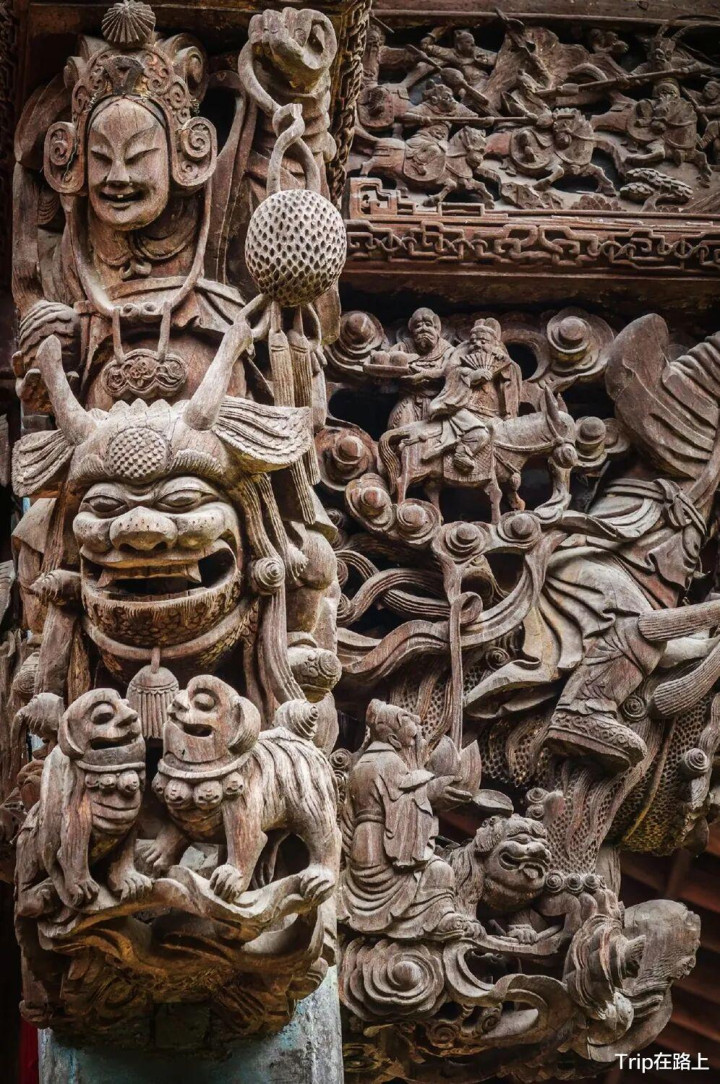 还有墙壁上饰有祯祥花木、瑞兽祥禽等图案,门窗上的木雕精良入微,石柱上的石雕大气磅礴。这些高超的雕镂,俨然是一座“民间艺术宝库”,展现嵊州三雕艺术的千年风华。
