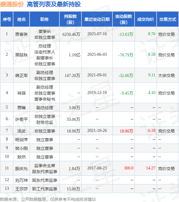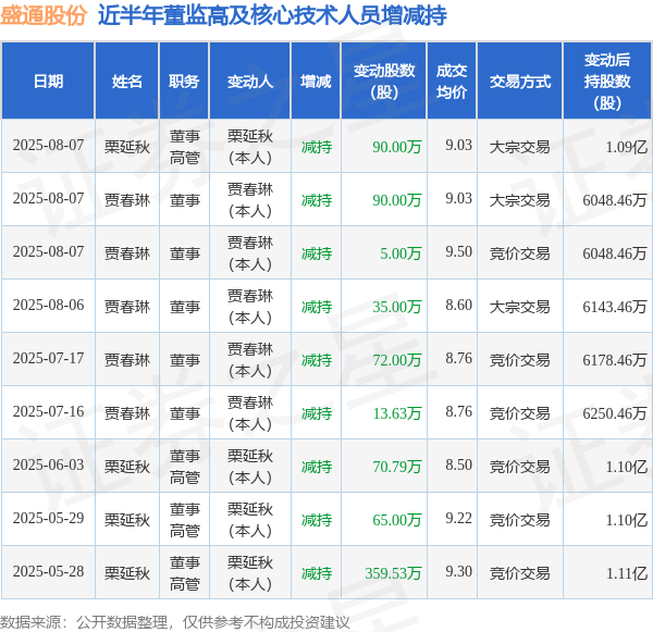 证券之星音信,左证8月8日商场公开信息、上市公司公告及往返所清楚数据整理,盛通股份(002599)最新董监高及关系东说念主员股份变动情况:2025年8月7日公司董事贾春琳、董事,高管栗延秋共减执公司股份185.0万股,占公司总股本为0.3474%。变动时候公司股价下落0.63%,8月7日当日收盘报9.5元。