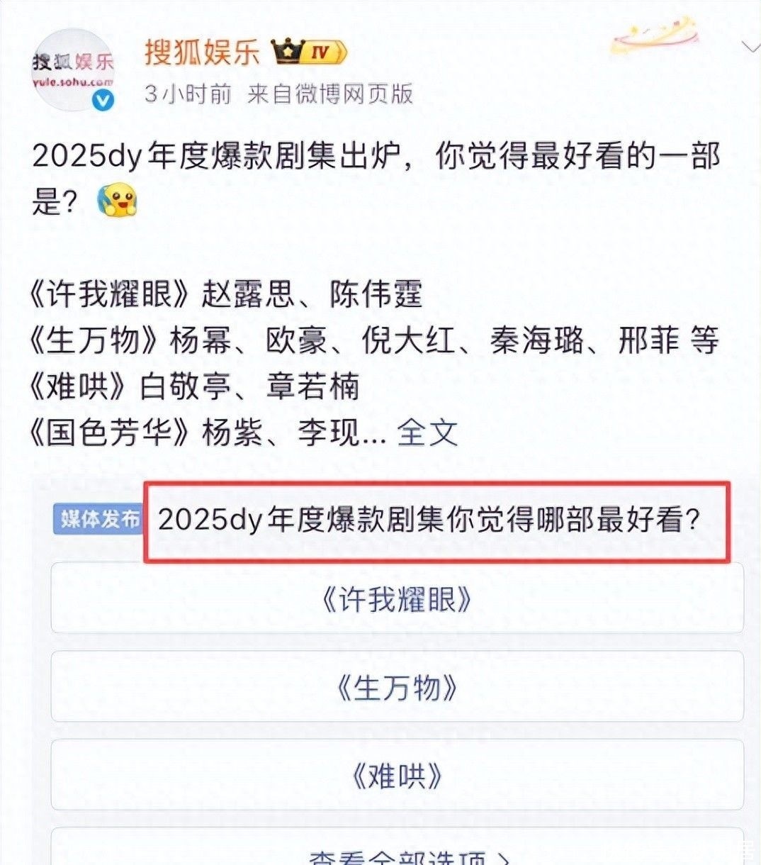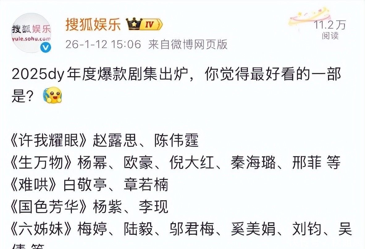 近期,微博搜狐文娱发起了一项名为“2025dy年代爆款网络你认为哪部最颜面”的线上评比步履,赶快点火网友热议,诱骗了海量不雅众奋勇投票,共同见证年度热点剧集的降生。
