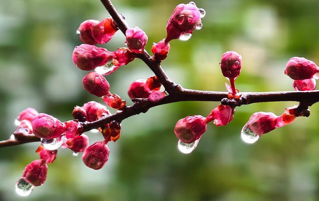 这是3月1日拍摄的河南省洛阳市街头花苞上的露水。一场春雨事后,晶莹彻亮的雨珠缀满枝端,勾画出别样春日景致。新华社发(峻岭岳摄)