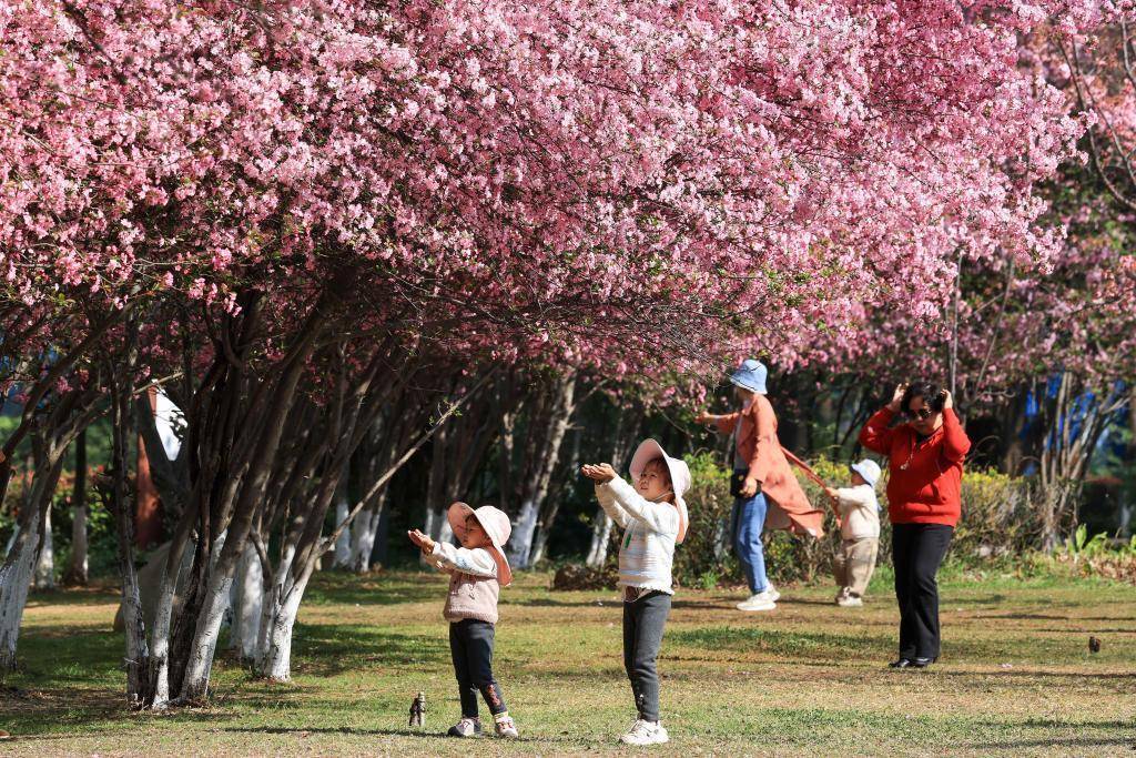 近日,旅客在云南省曲靖市沾益区玉林广场海棠花树下赏景游玩。新华社发(孙文来摄)