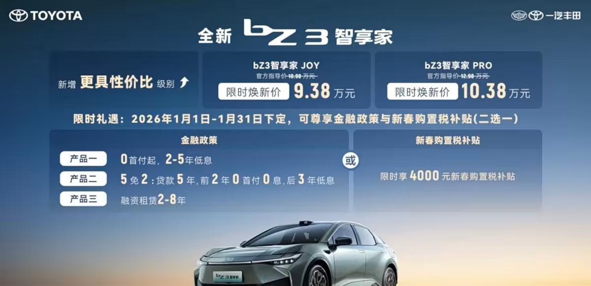 关于一汽丰田来说,念念要把电车卖出去,念念到的倡导等于“以价换量”,比如2024款bZ3售价16.98-19.98万元,可在推出2026款车型的时分,平直等于10.98-15.98万元的售价,其中,智享家 JOY和智享家 PRO的限时焕新价为9.38万元和10.38万元。相干于2024款车型16.98万元的初学价钱,新车的初学价钱平直下跌了7.6万元。关于一款纯电动B级车来说,9.38万元的初学价钱以致比一些国产同级车型还要更低一些。